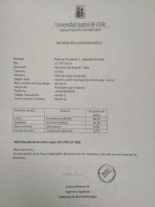 Certificación de análisis de miel de origen botánico del laboratorio de Entomología de la Universidad Austral de Chile.